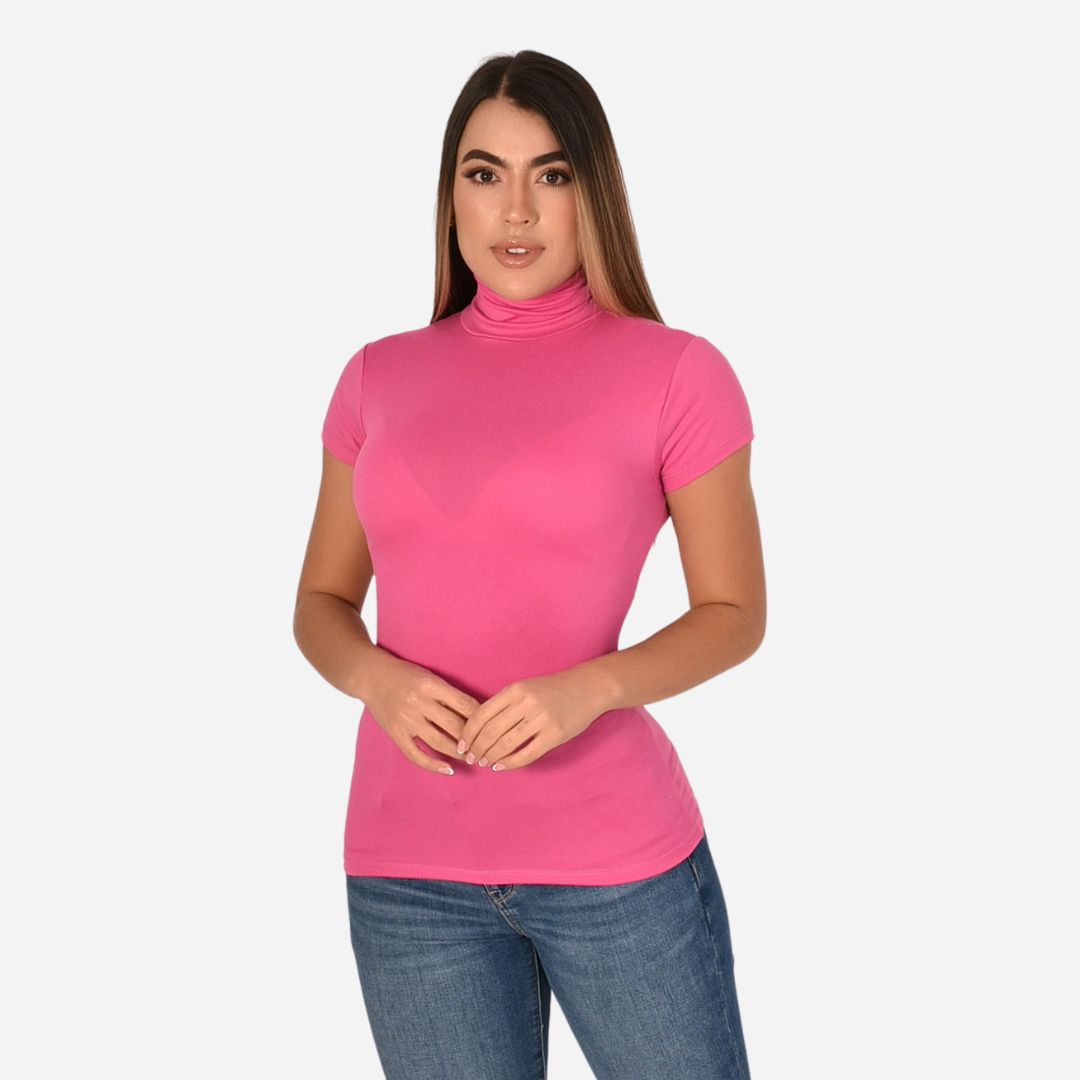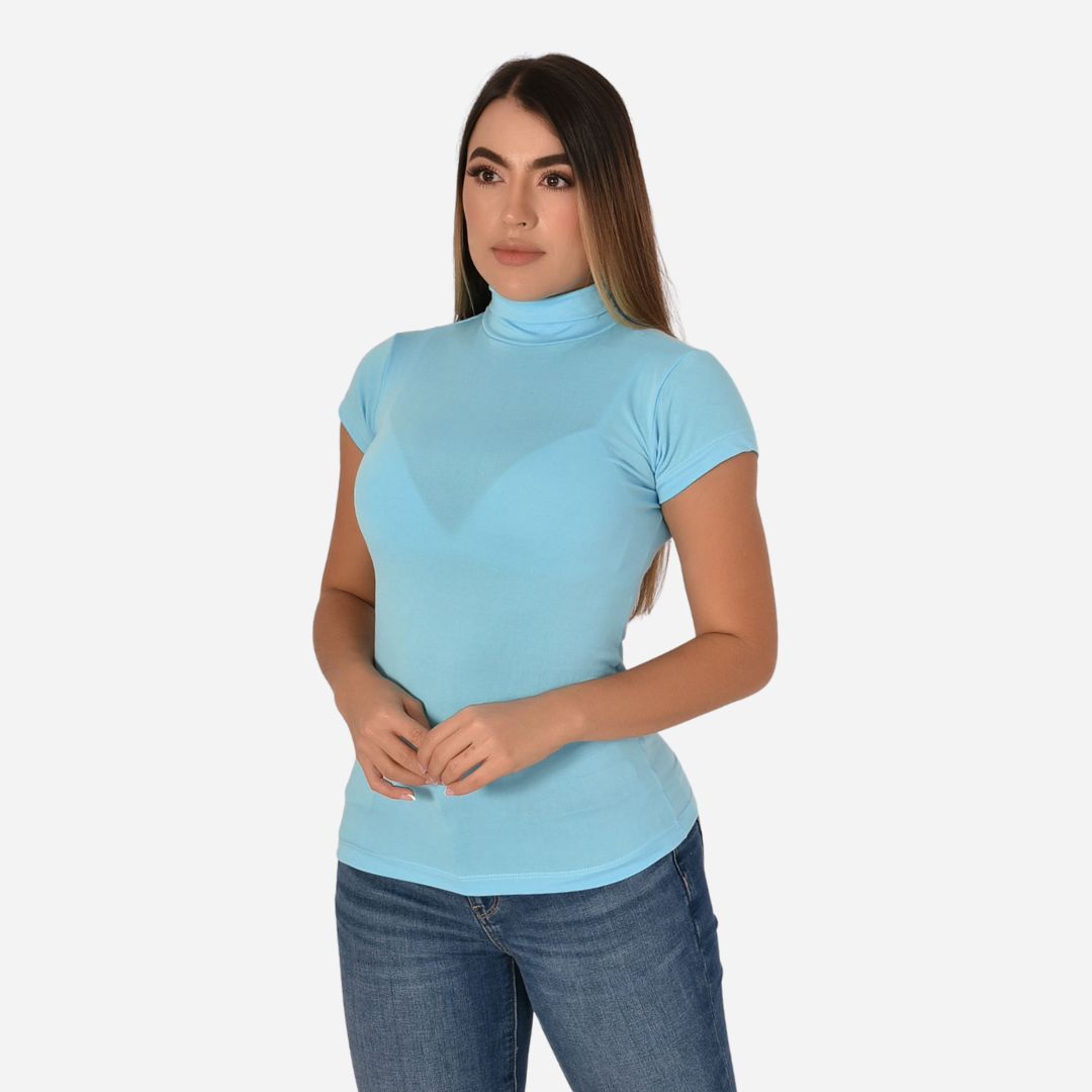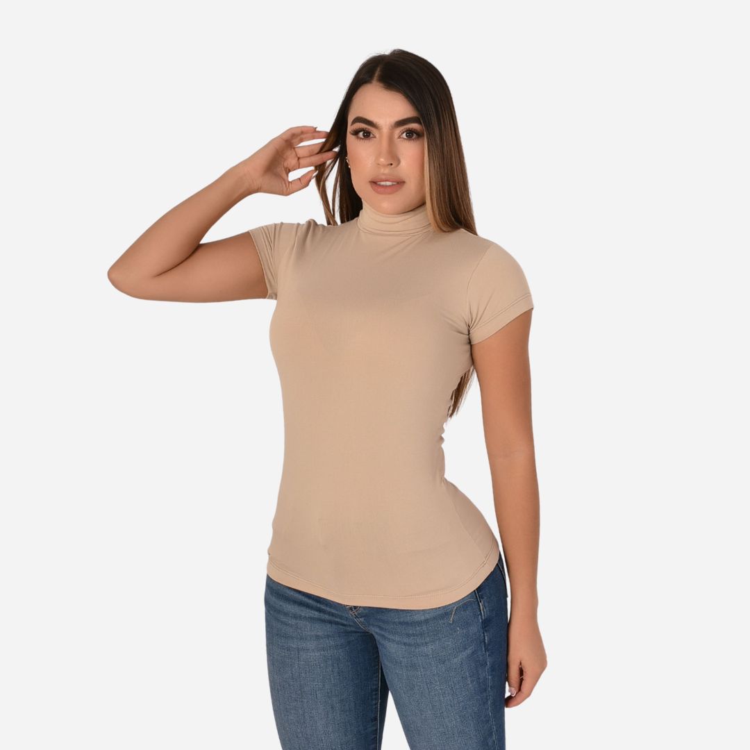 Blusa Básica de dama elaborada en tela piel de durazno, manga corta, cuello alto, silueta ajustada.