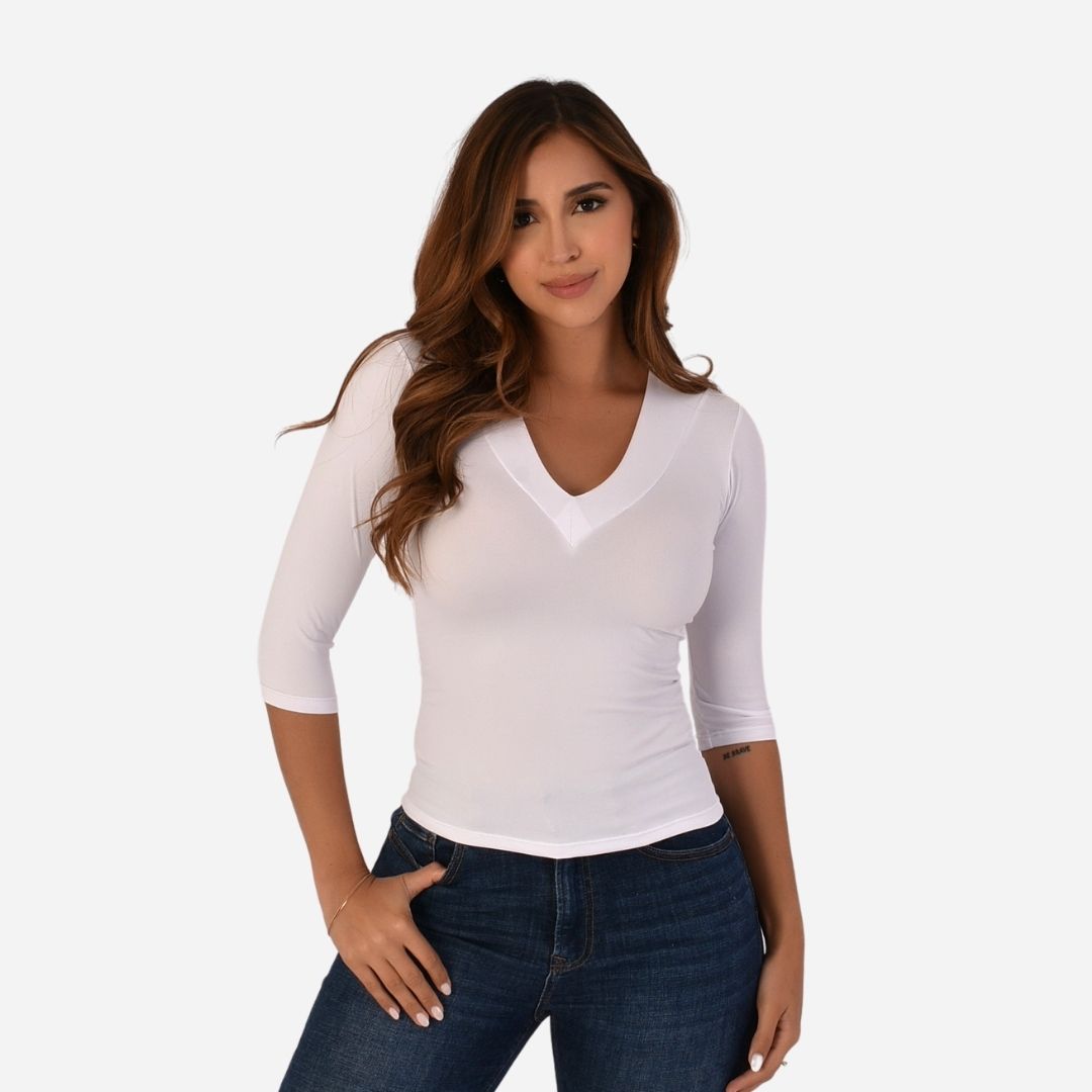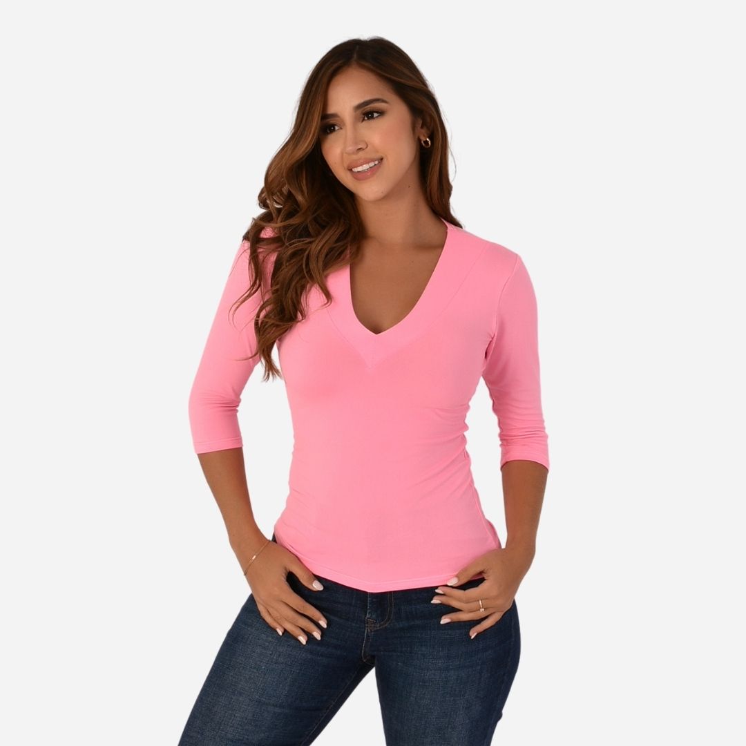 Blusa Básica de dama elaborada en tela piel de durazno, manga 3/4, cuello en V, silueta ajustada.