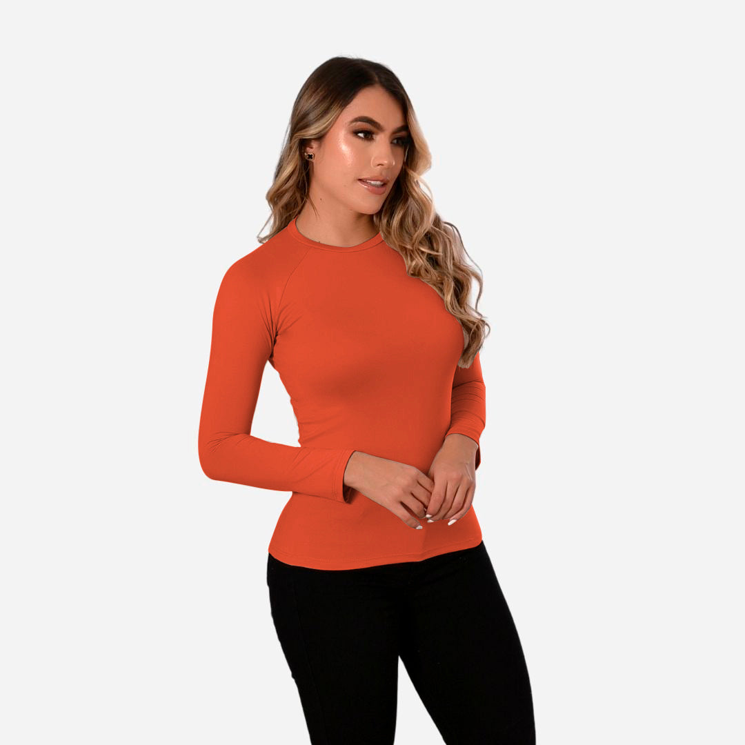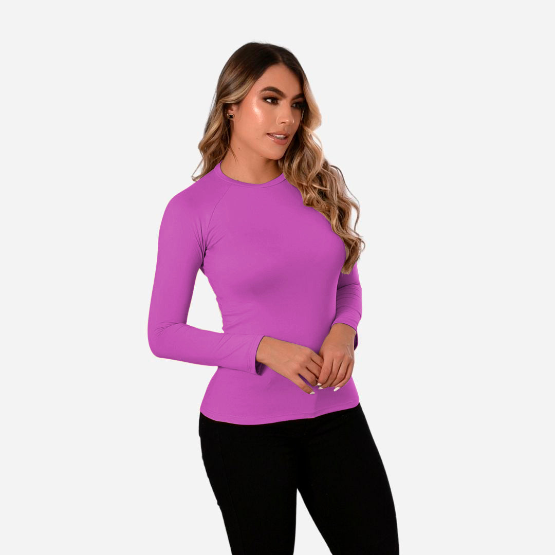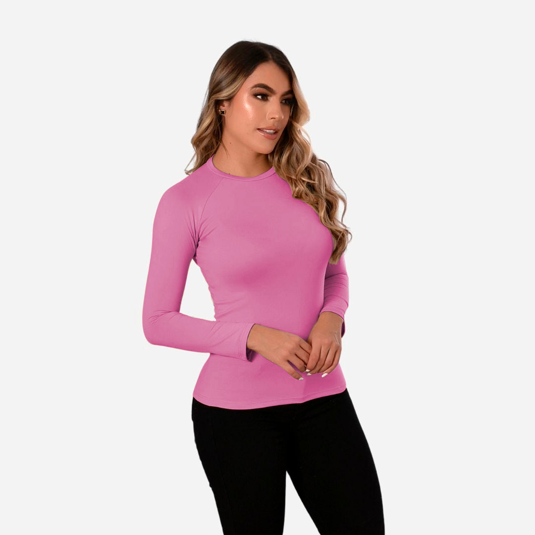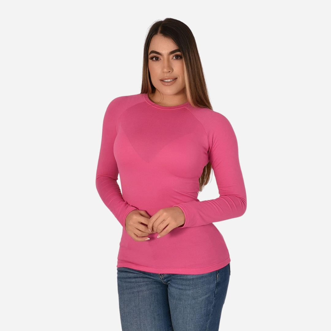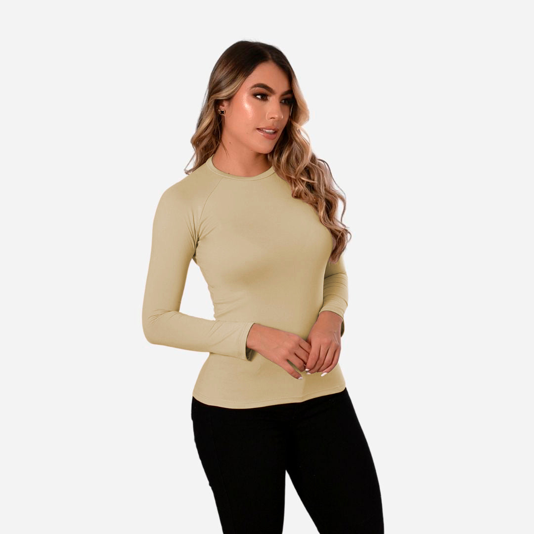 Blusa Básica de dama elaborada en tela piel de durazno, manga larga, cuello redondo cerrado, silueta ajustada.