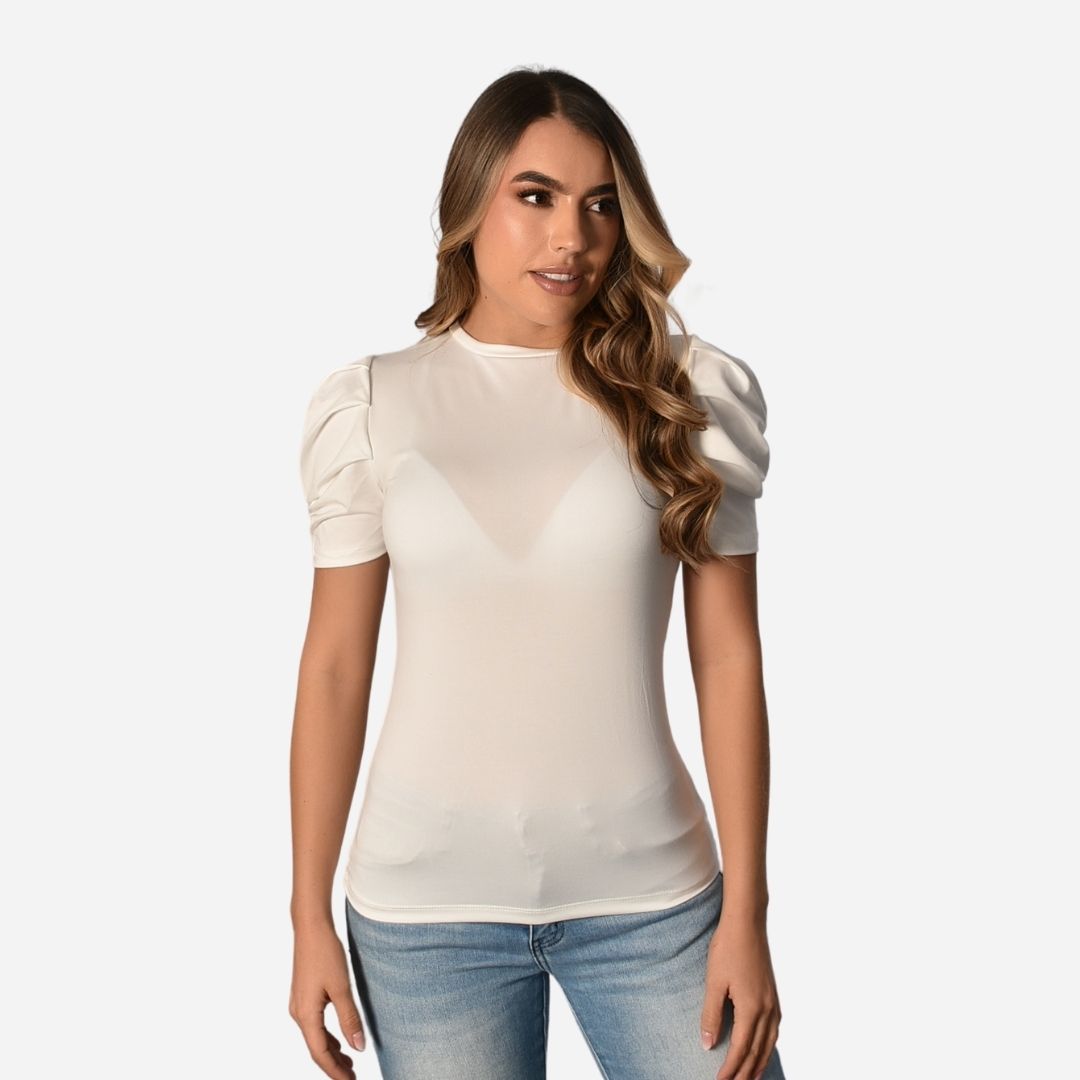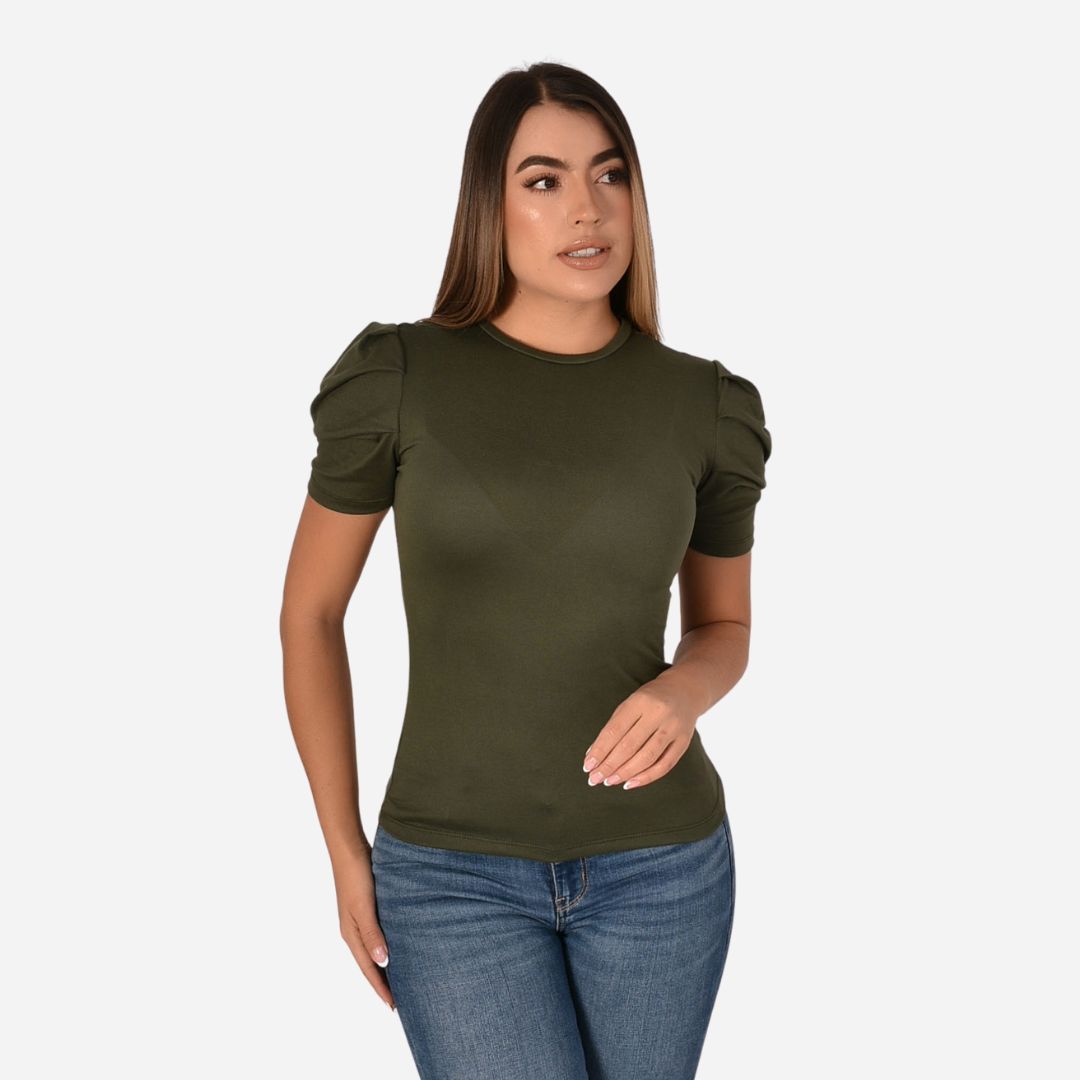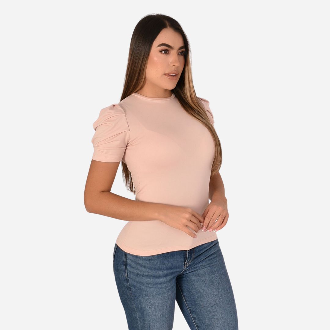 Blusa Básica de dama elaborada en tela piel de durazno, manga corta con prenses, cuello redondo, silueta semiajustada.
