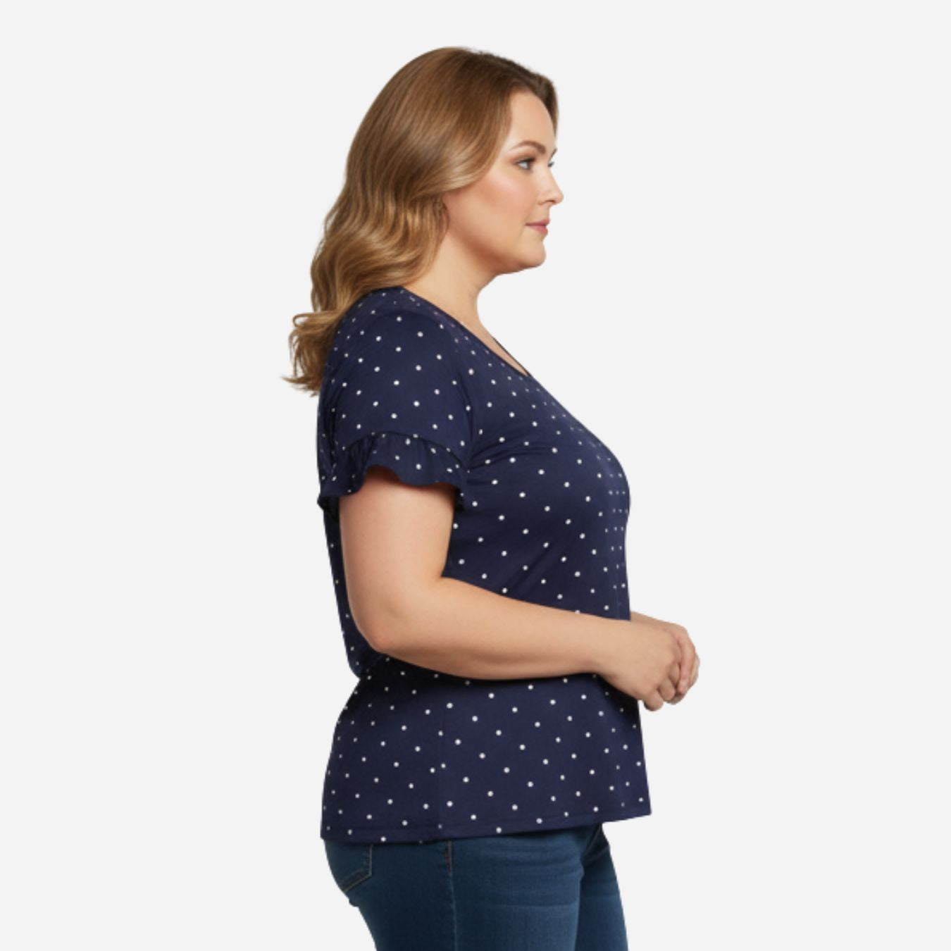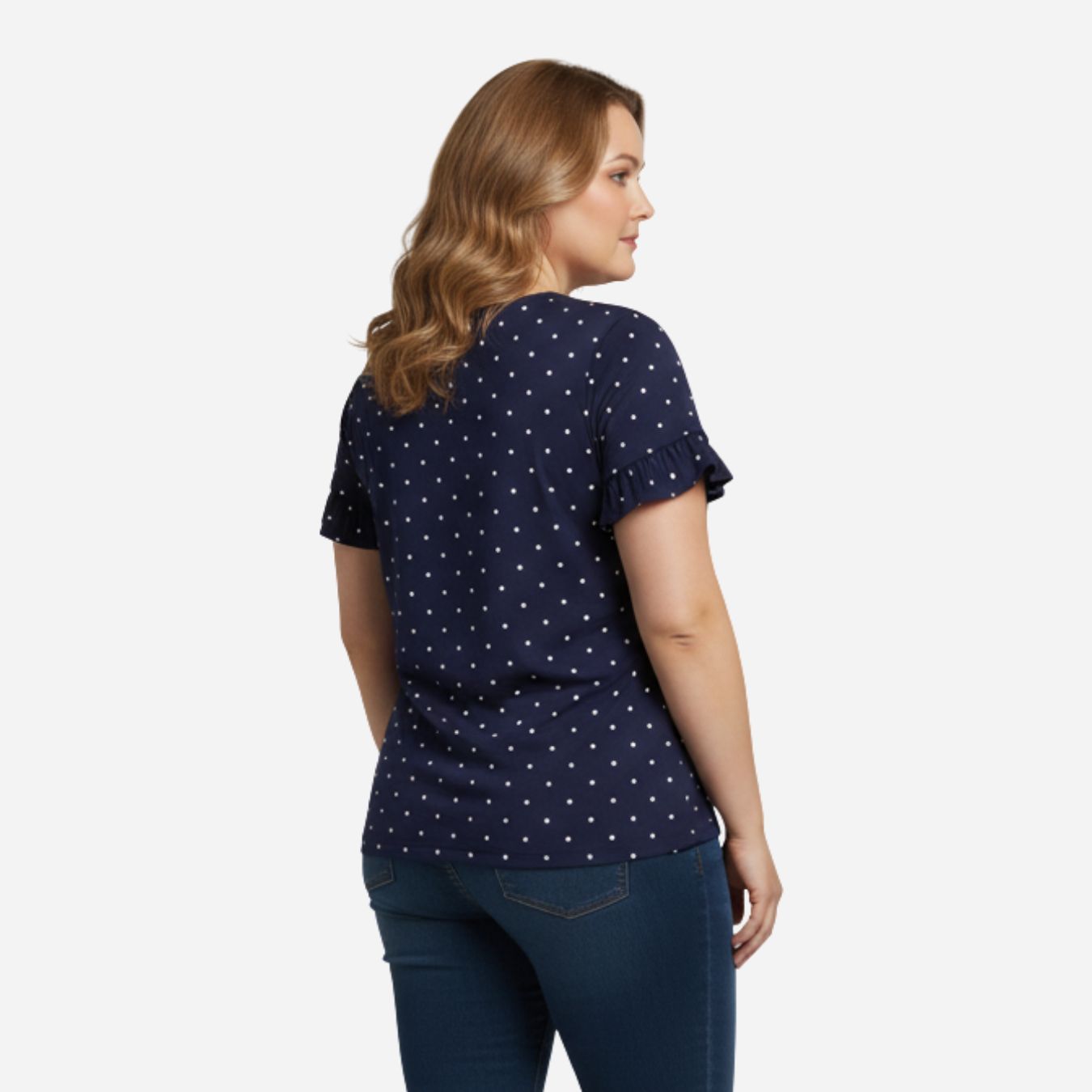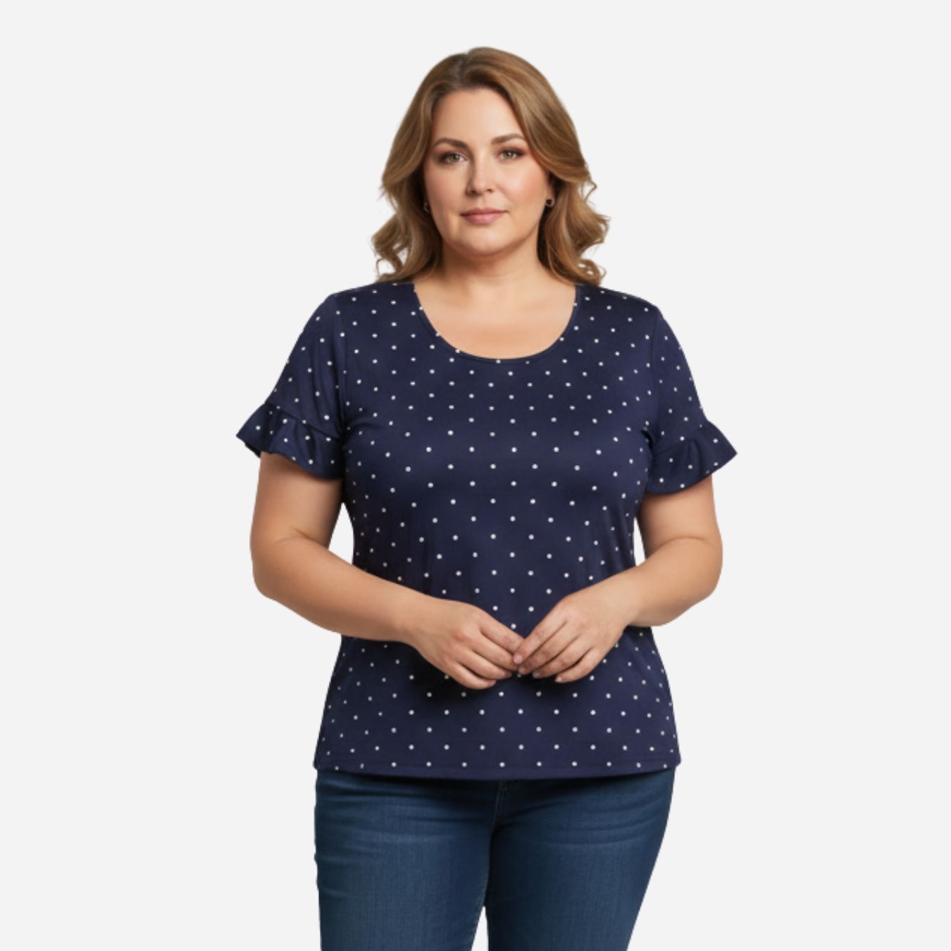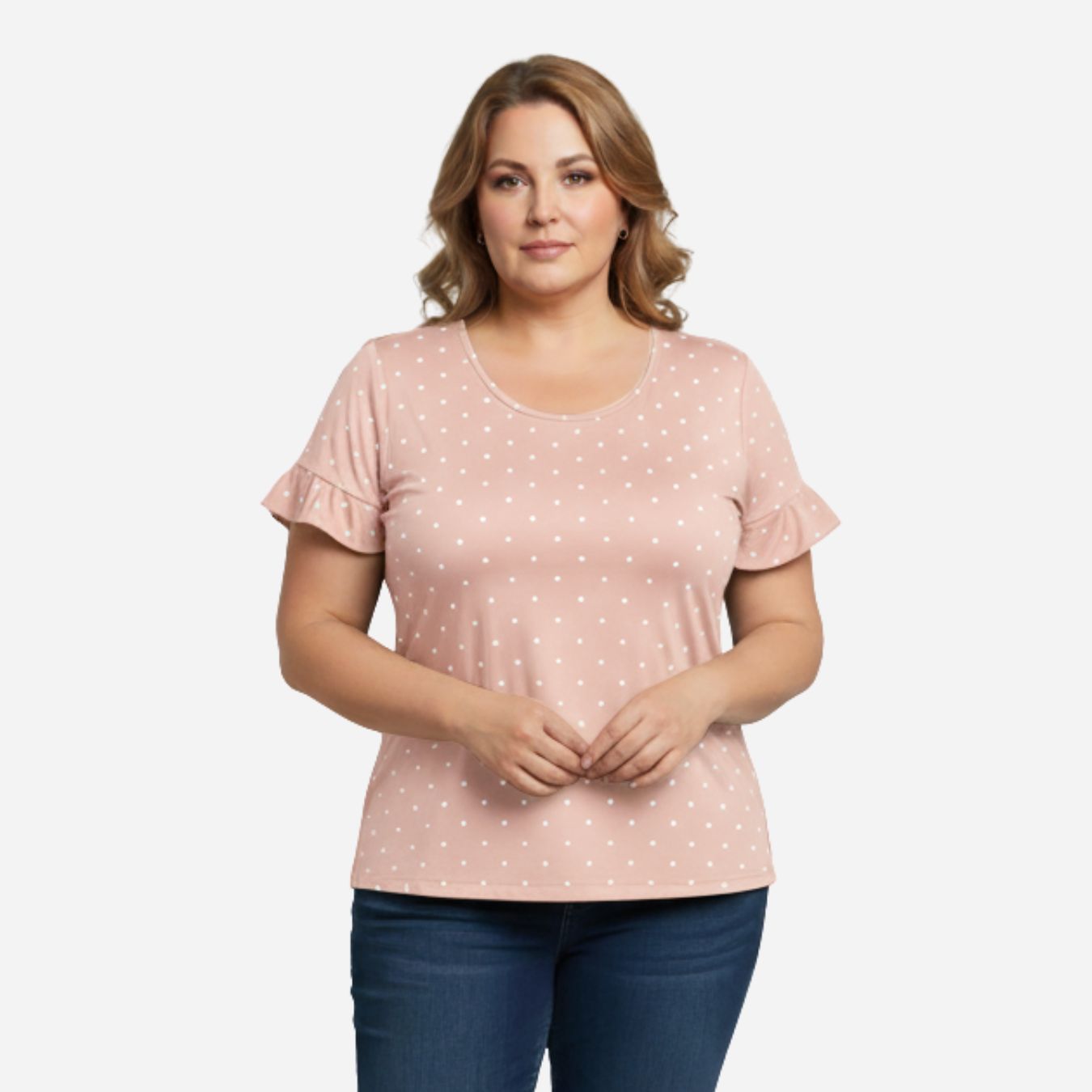 Blusa de dama plus marca CFX , Blusa elaborada en tela piel de durazno de tacto suave y agradable, ideal para brindar frescura y comodidad. Presenta cuello redondo clásico y mangas cortas con delicados volantes que aportan un estilo femenino y elegante.