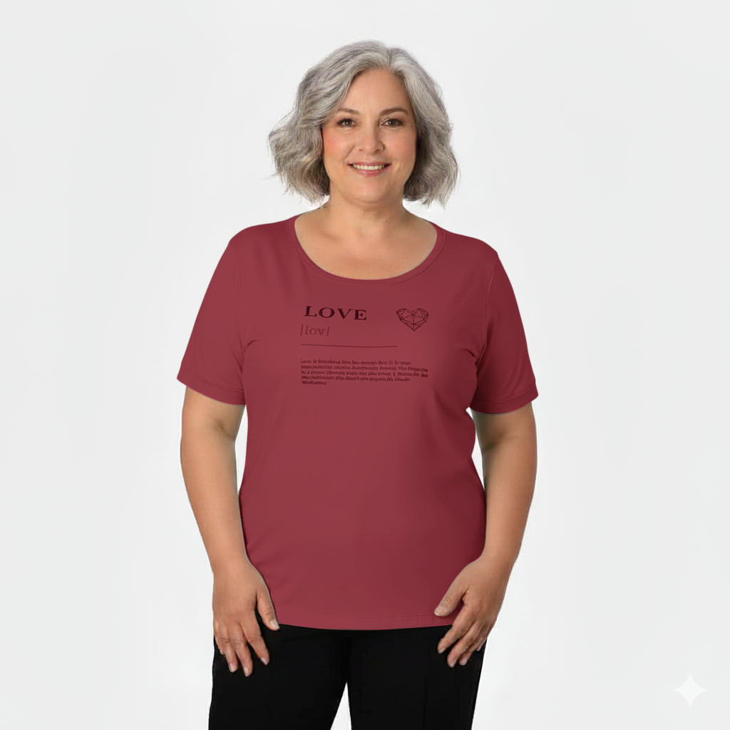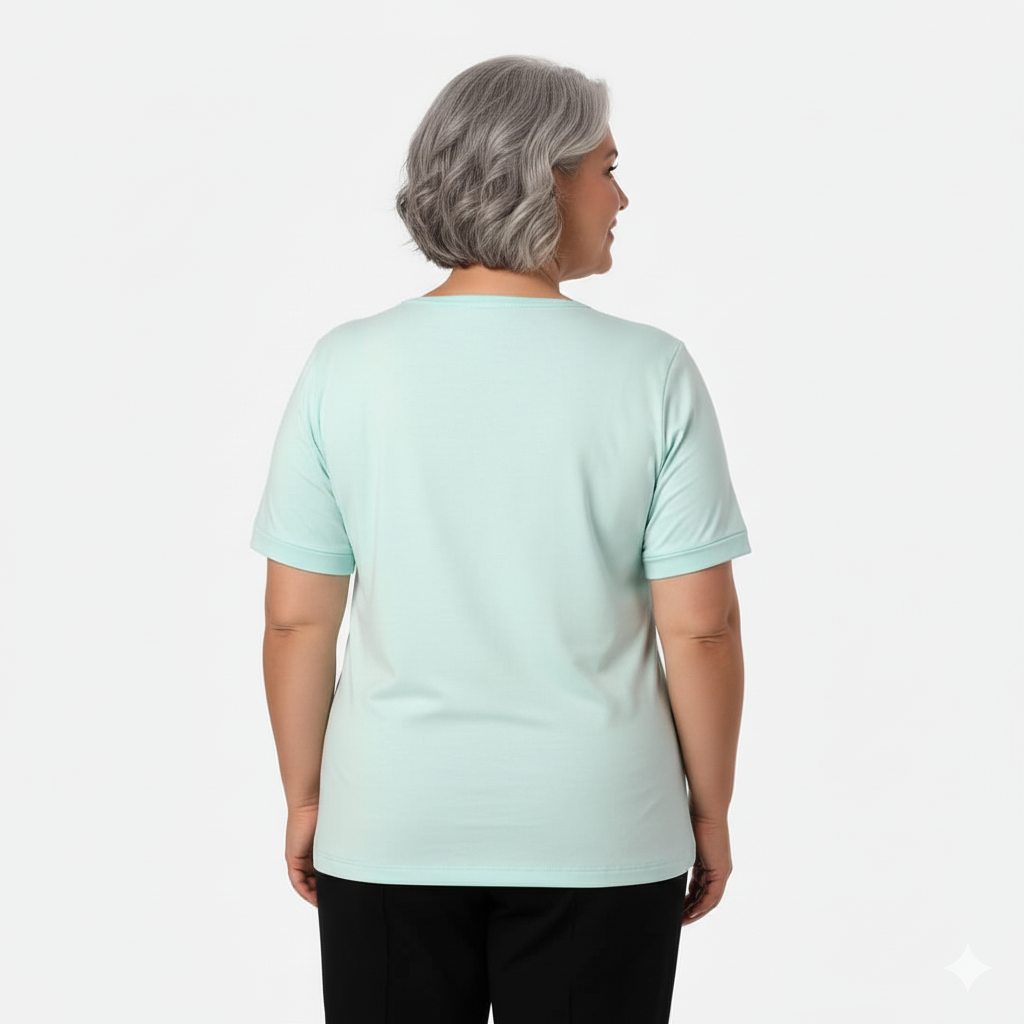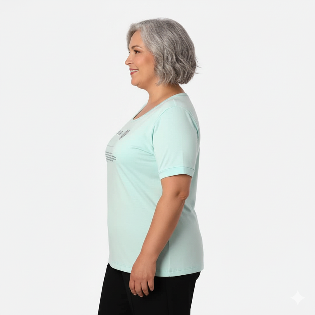 Blusa de dama plus elaborada en tela piel de durazno, manga corta con puño, cuello redondo, con estampado localizado en...