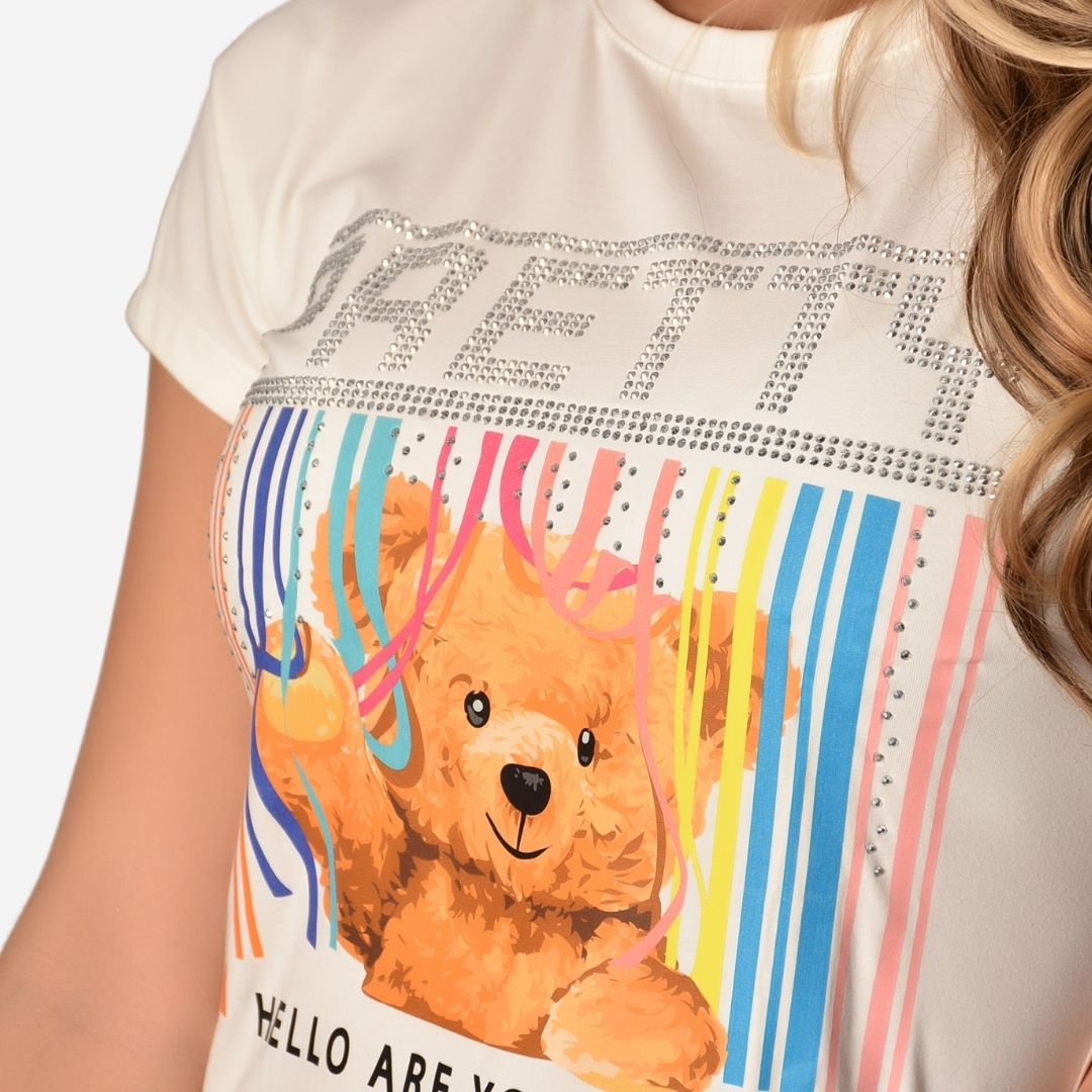 Con un estampado localizado de un adorable oso en la parte frontal, le da un toque único y divertido a tu look. Su cuello redondo, mangas cortas y silueta abierta ofrecen una silueta relajada y fresca, ideal para cualquier ocasión.