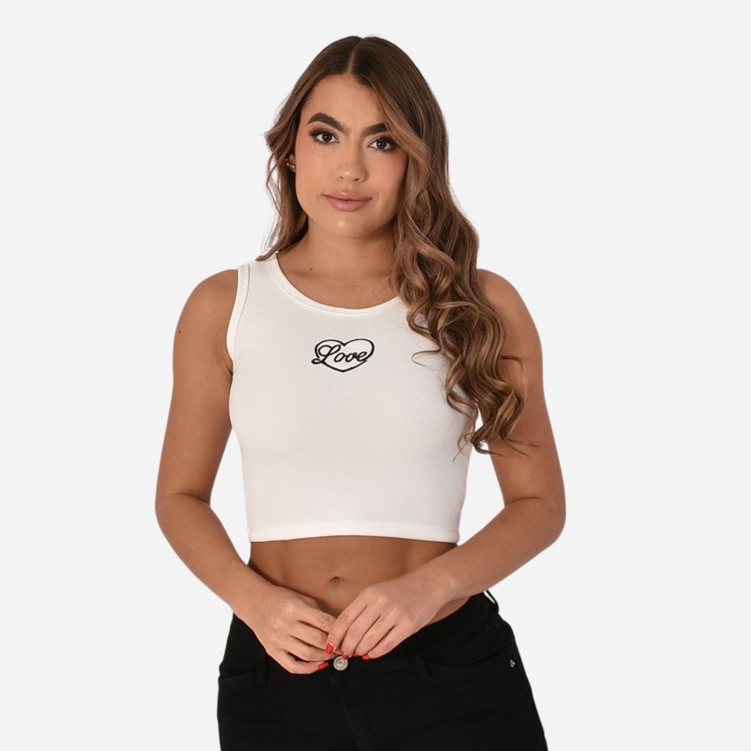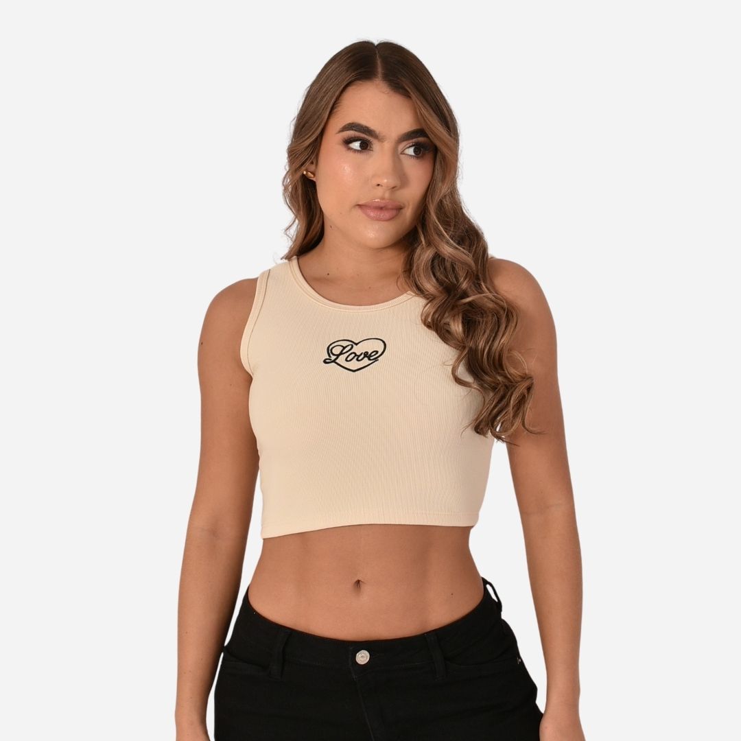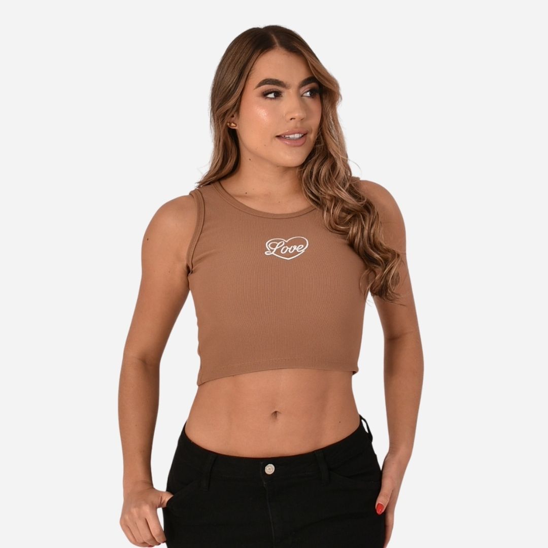 Cuenta con un diseño localizado en la parte frontal, cuello redondo, sin mangas y silueta ajustada tipo crop, ideal para looks modernos y urbanos que resaltan la figura.