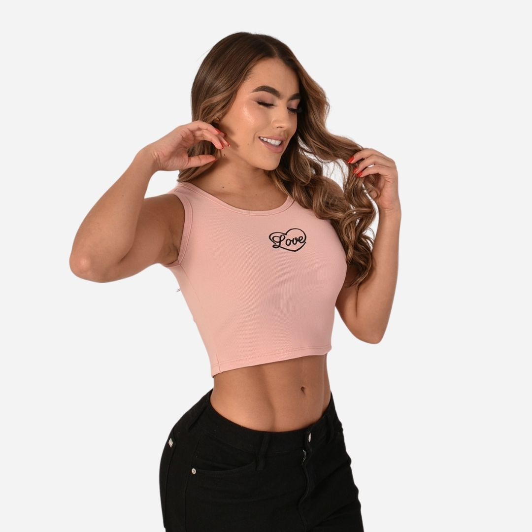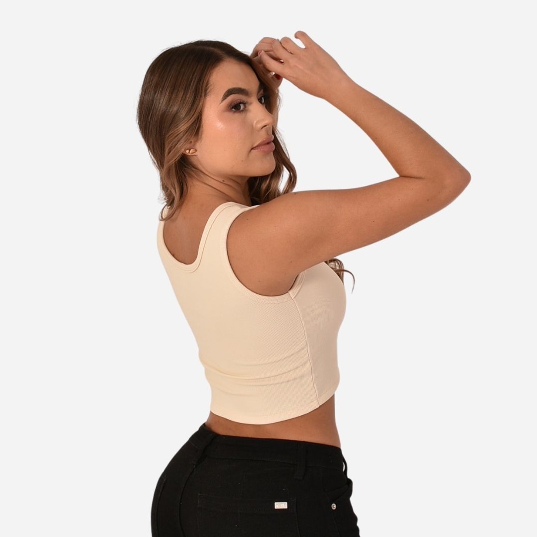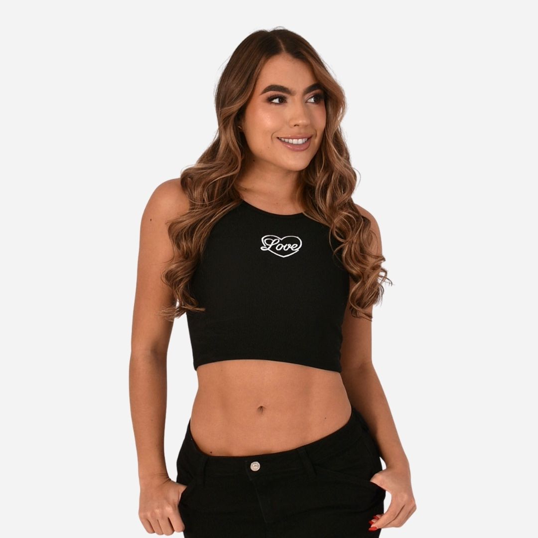 Cuenta con un diseño localizado en la parte frontal, cuello redondo, sin mangas y silueta ajustada tipo crop, ideal para looks modernos y urbanos que resaltan la figura.