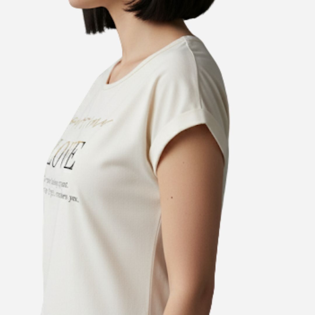 Blusa de dama marca CFX, elaborada en tela piel de durazno suave y ligera. Cuenta con manga corta, cuello redondo y silueta abierta que brinda frescura y comodidad.