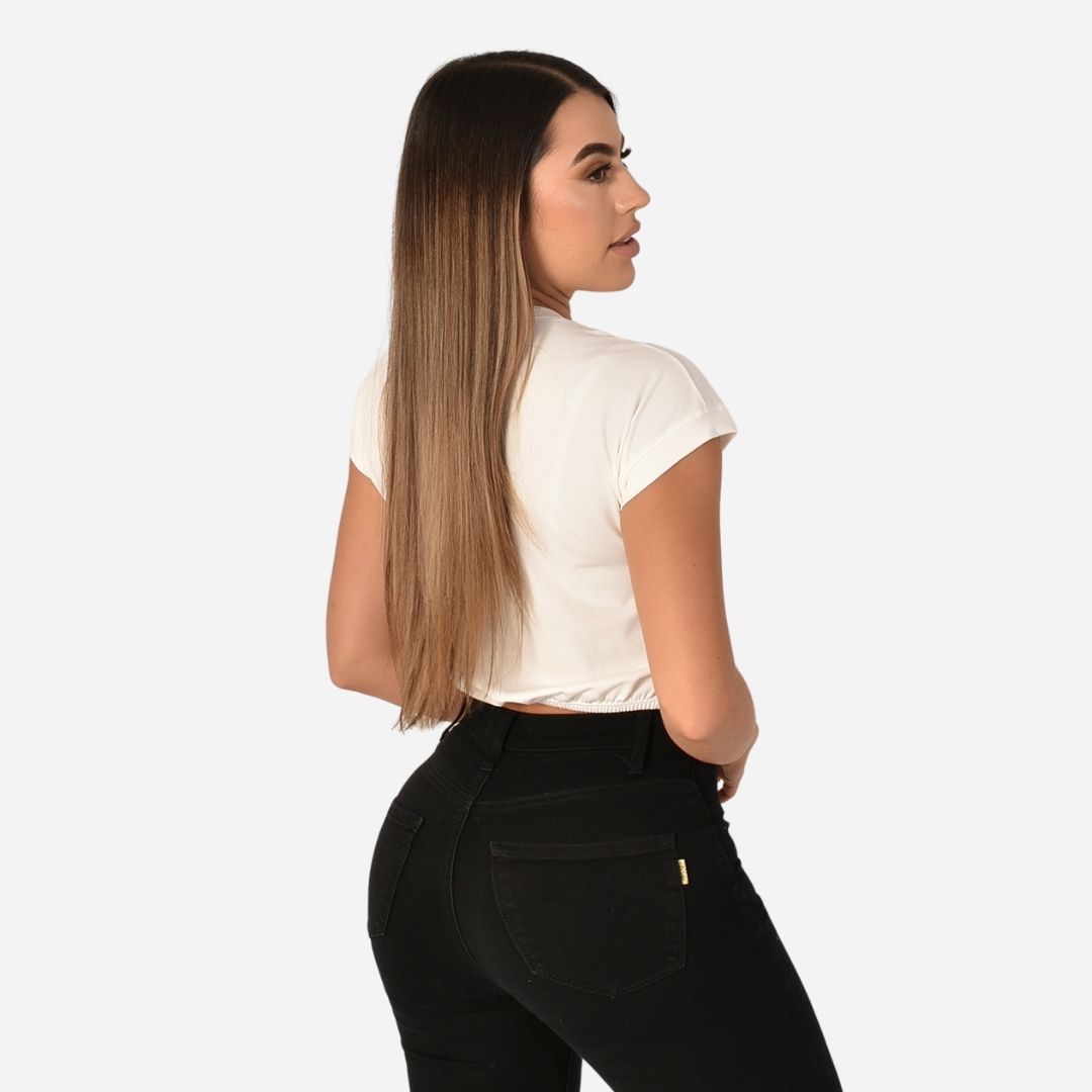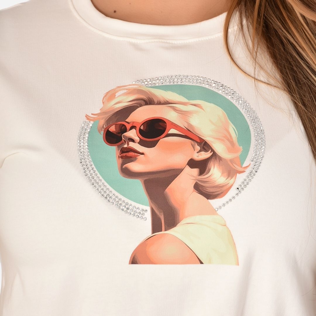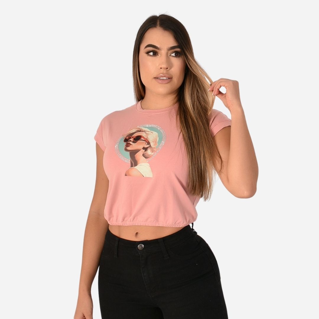Presenta un diseño localizado en la parte frontal que aporta un toque distintivo y moderno. Cuenta con cuello redondo, manga corta con guardapolvo y cintura resortada que se ajusta cómodamente, resaltando la silueta sin perder libertad de movimiento.