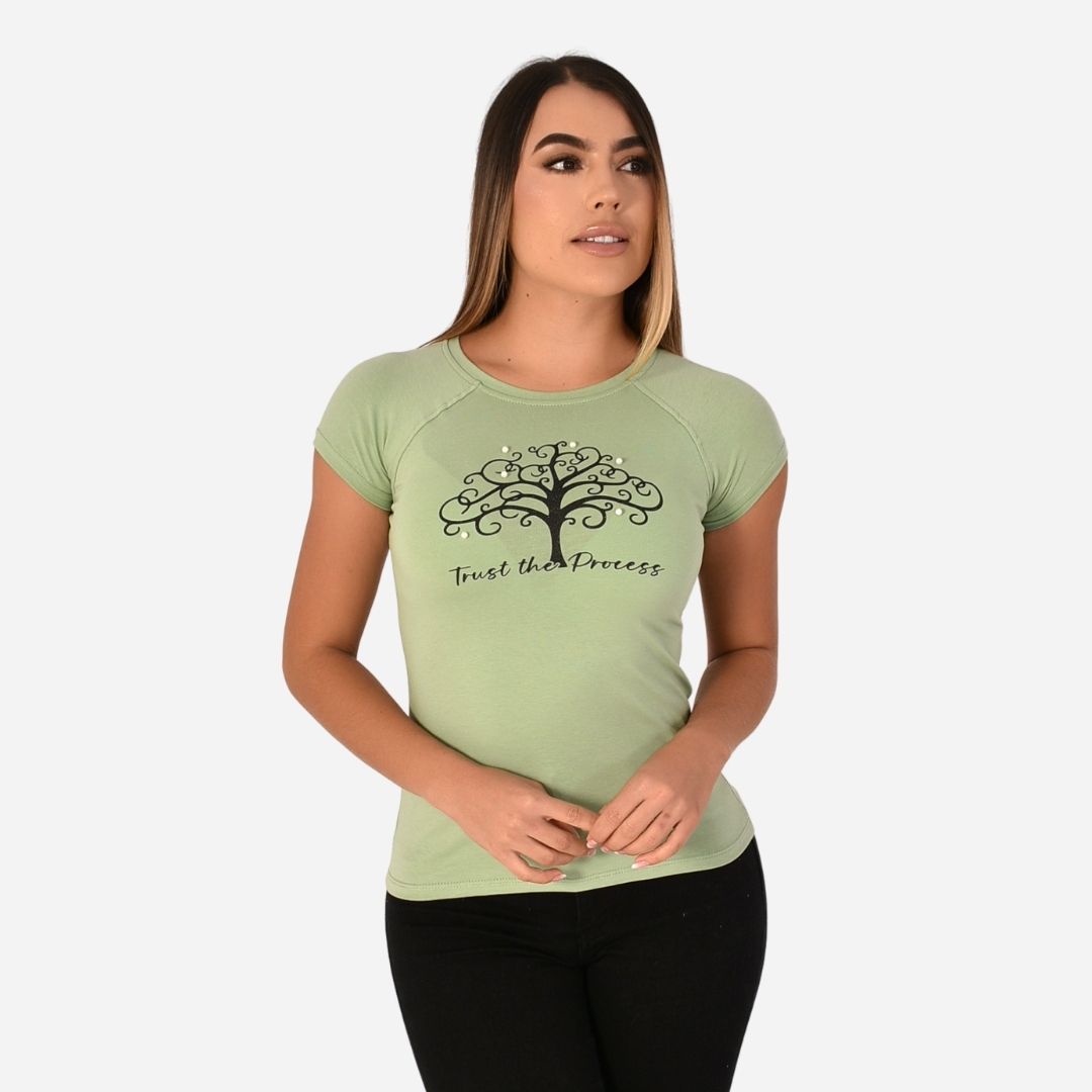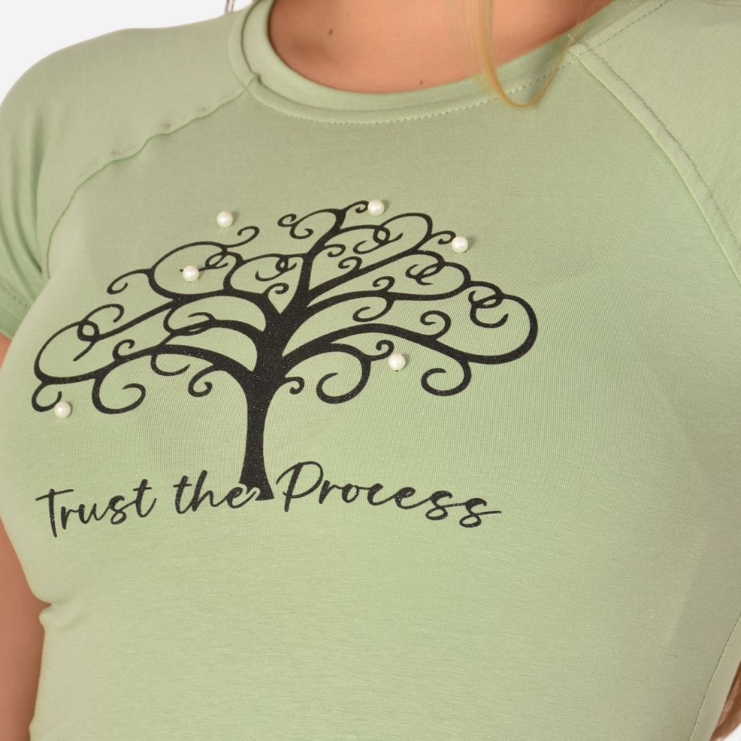 Presenta un diseño localizado en la parte frontal con un hermoso árbol y la frase “Trust the process”, que transmite calma y confianza.