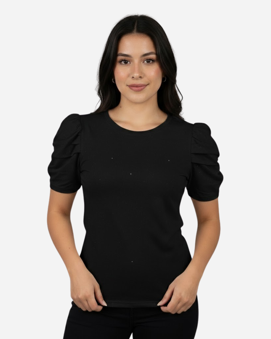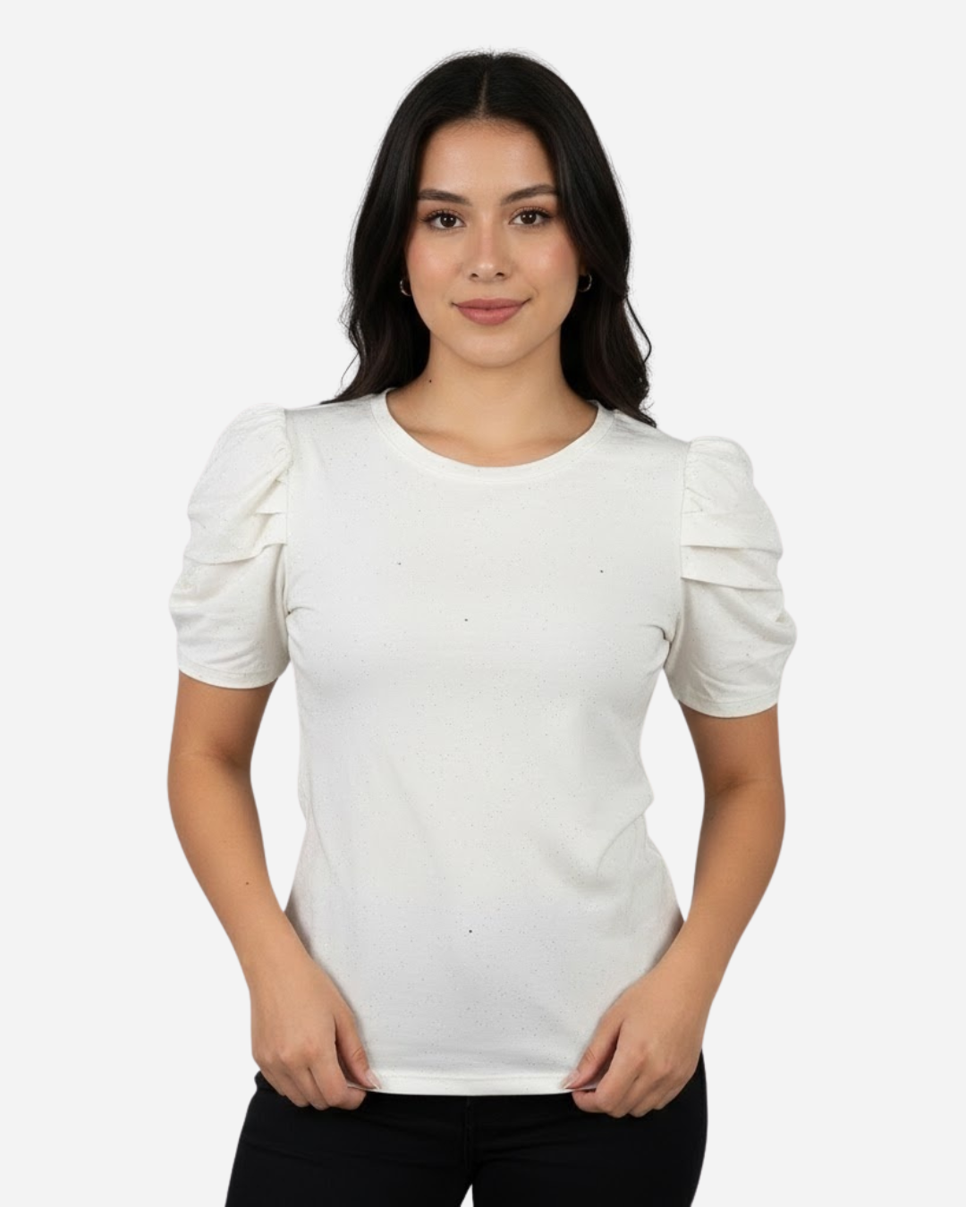 Presenta cuello redondo y manga corta con diseño abullonado y delicados pliegues, que aportan un estilo femenino y elegante. Su silueta semi ajustada se adapta al cuerpo de forma favorecedora, permitiendo crear outfits tanto casuales como más formales según la combinación.