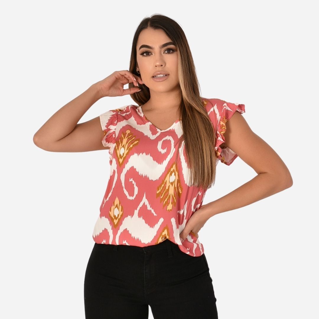 Presenta cuello en V que estiliza la figura, manga corta con elegantes boleros que aportan movimiento y un toque femenino.