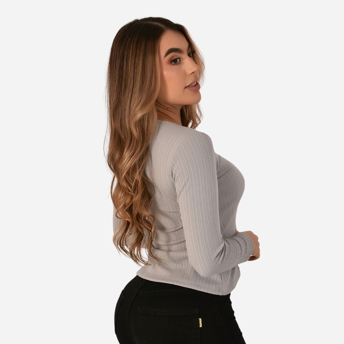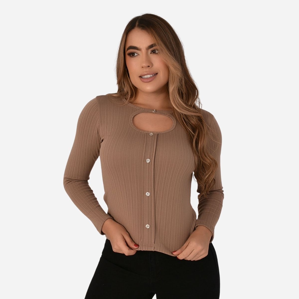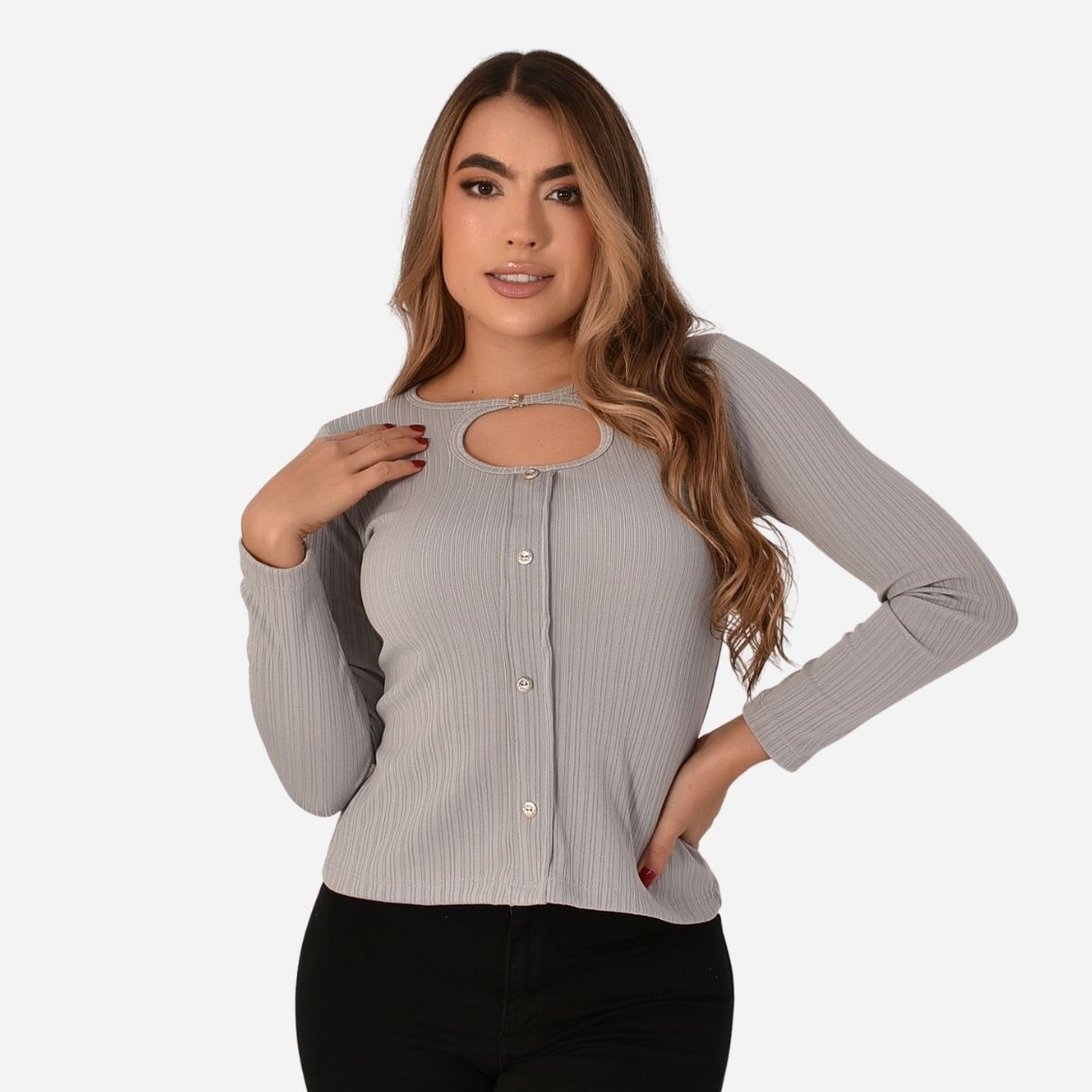 Diseño con cuello redondo y abertura en el pecho, complementado con botones decorativos que aportan un detalle moderno y femenino. Cuenta con manga larga y silueta semi ajustada, ideal para estilizar la figura sin perder confort.