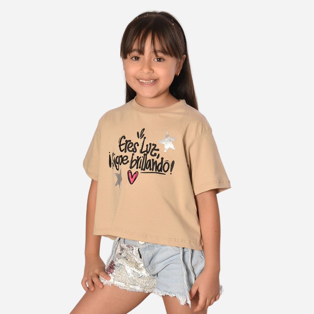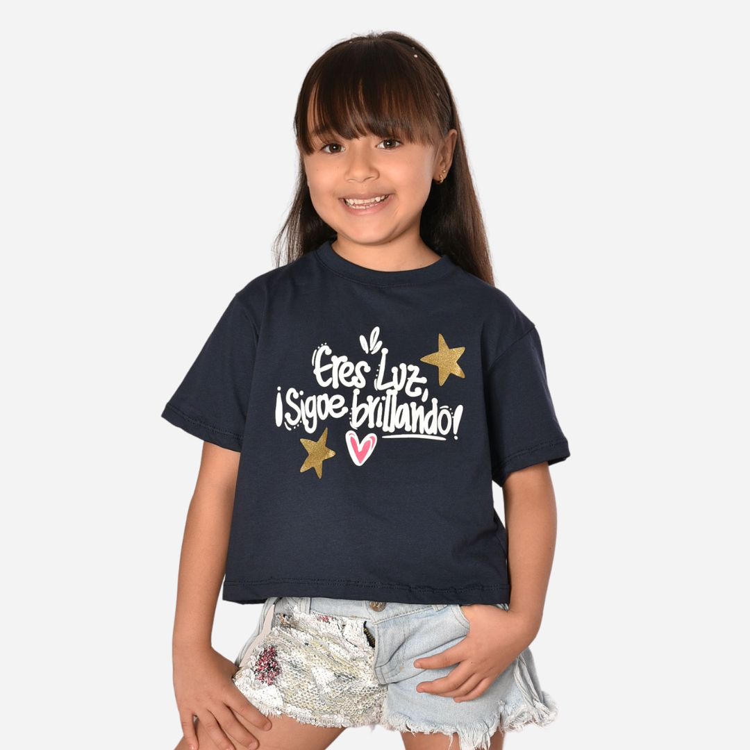 Deja que brille su personalidad con nuestra blusa junior de moda para niña. Confeccionada en 100% algodón, presenta un encantador estampado frontal que dice "Eres luz, sigue brillando". Su silueta abierta ofrece comodidad y libertad de movimiento, ideal para el día a día. ¡Perfecta para que ella se sienta única y llena de energía!