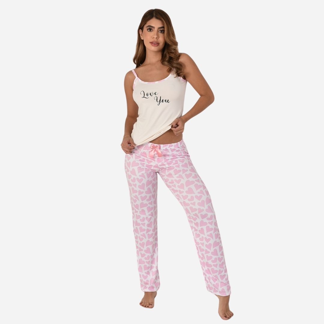 Pijama de dama marca SYG, compuesta por blusa de tirantes y pantalón largo, confeccionada en tela piel de durazno de...